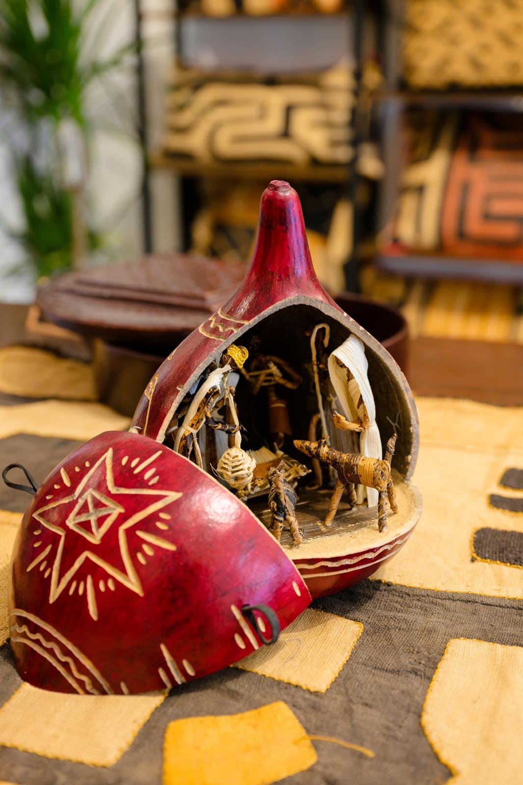 Atmosphère : Les couleurs naturelles et douces des figurines contrastent avec le fond sombre de la calebasse, mettant en valeur la scène sacrée.
