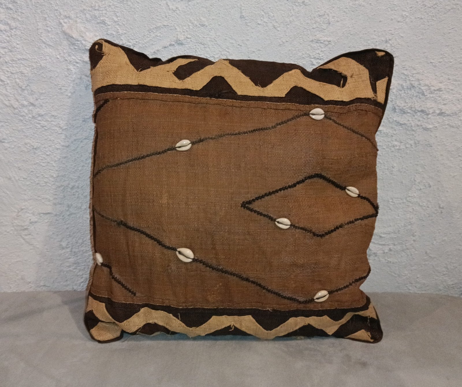 Cette housse de coussin est réalisée en tissu Kuba traditionnel, un textile artisanal emblématique du Kasaï en République Démocratique du Congo. Confectionnée en raphia naturel, elle se distingue par ses motifs géométriques sobres, ses lignes brodées irrégulières et l’ajout d’éléments symboliques : les cauris, minutieusement cousus à la main.
