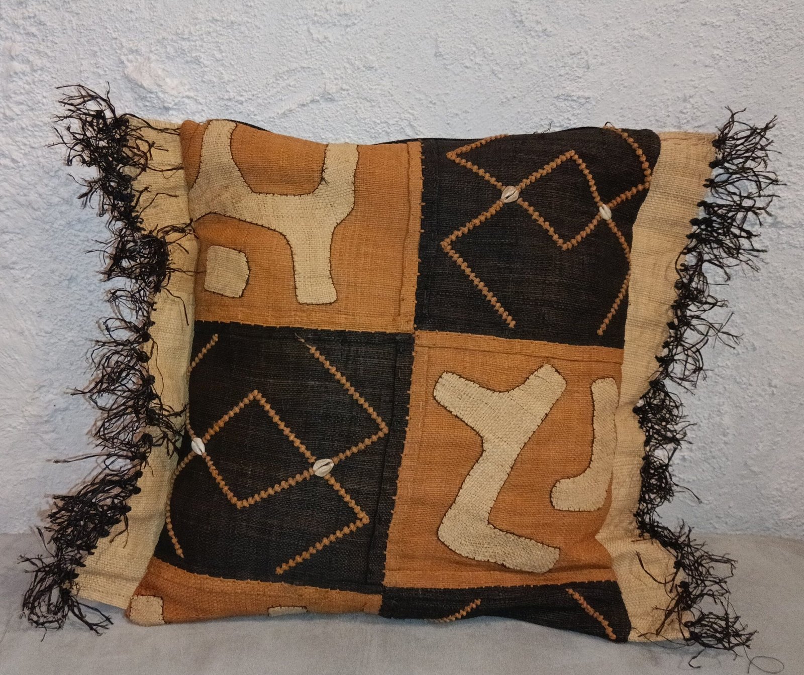 Les côtés gauche et droit sont soulignés par de franges en fibres naturelles, laissées volontairement libres. Ces franges apportent du mouvement, renforcent l’aspect artisanal de la pièce et encadrent visuellement le coussin. Le contraste entre les zones sombres et les motifs clairs accentue la lisibilité du dessin, tandis que la trame irrégulière du raphia met en valeur le travail manuel.
