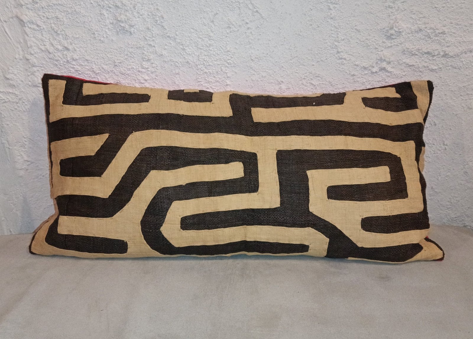 Cette housse de coussin rectangulaire en tissu Kuba traditionnel est réalisée en raphia naturel et ornée d’un motif noir linéaire sur fond beige. Son design graphique et son format allongé en font une pièce parfaite pour structurer un canapé ou donner du caractère à un intérieur bohème, ethnique ou minimaliste. Entièrement artisanale, chaque housse est unique et apporte chaleur et authenticité à la décoration.