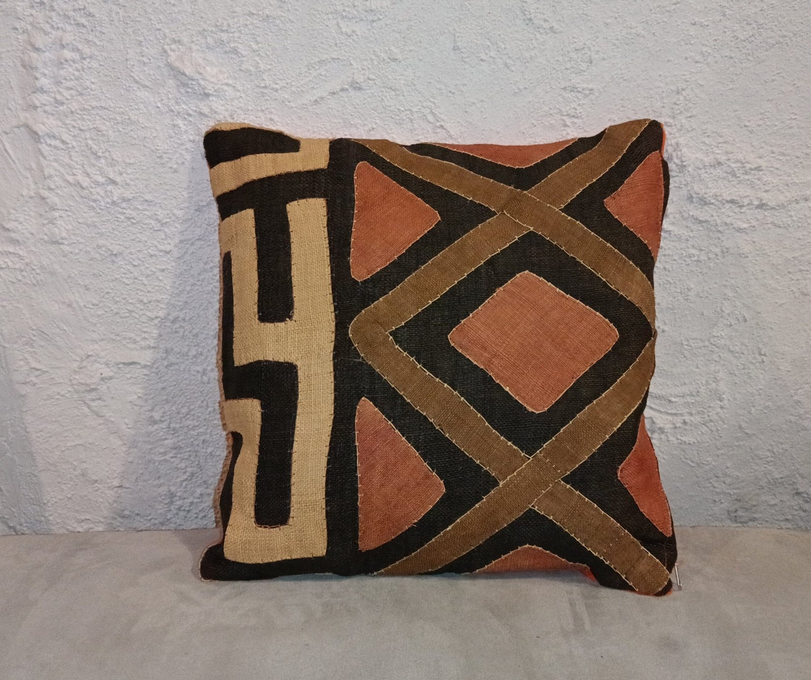 Ce coussin artisanal de 35 x 35 cm est réalisé à partir de raphia tissé à la main et de tissu Kuba du Kasaï, un textile africain emblématique issu du savoir-faire ancestral des artisans du Congo. Les motifs géométriques, caractéristiques de la tradition Kuba, sont soigneusement assemblés pour créer une pièce à la fois authentique et décorative.