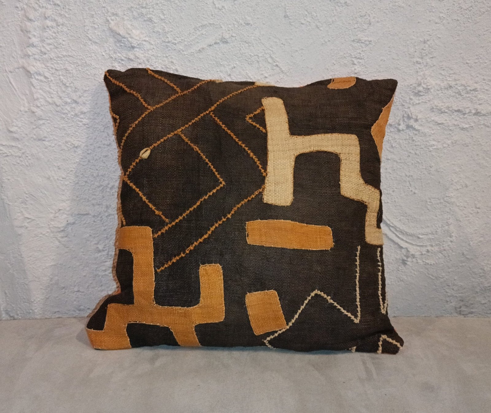 Cette housse de coussin est réalisée en tissu Kuba traditionnel, un textile emblématique du Kasaï en République Démocratique du Congo. Confectionnée en raphia naturel, elle se distingue par ses motifs géométriques appliqués, ses broderies contrastées et son esthétique graphique forte, typique de l’art textile Kuba.