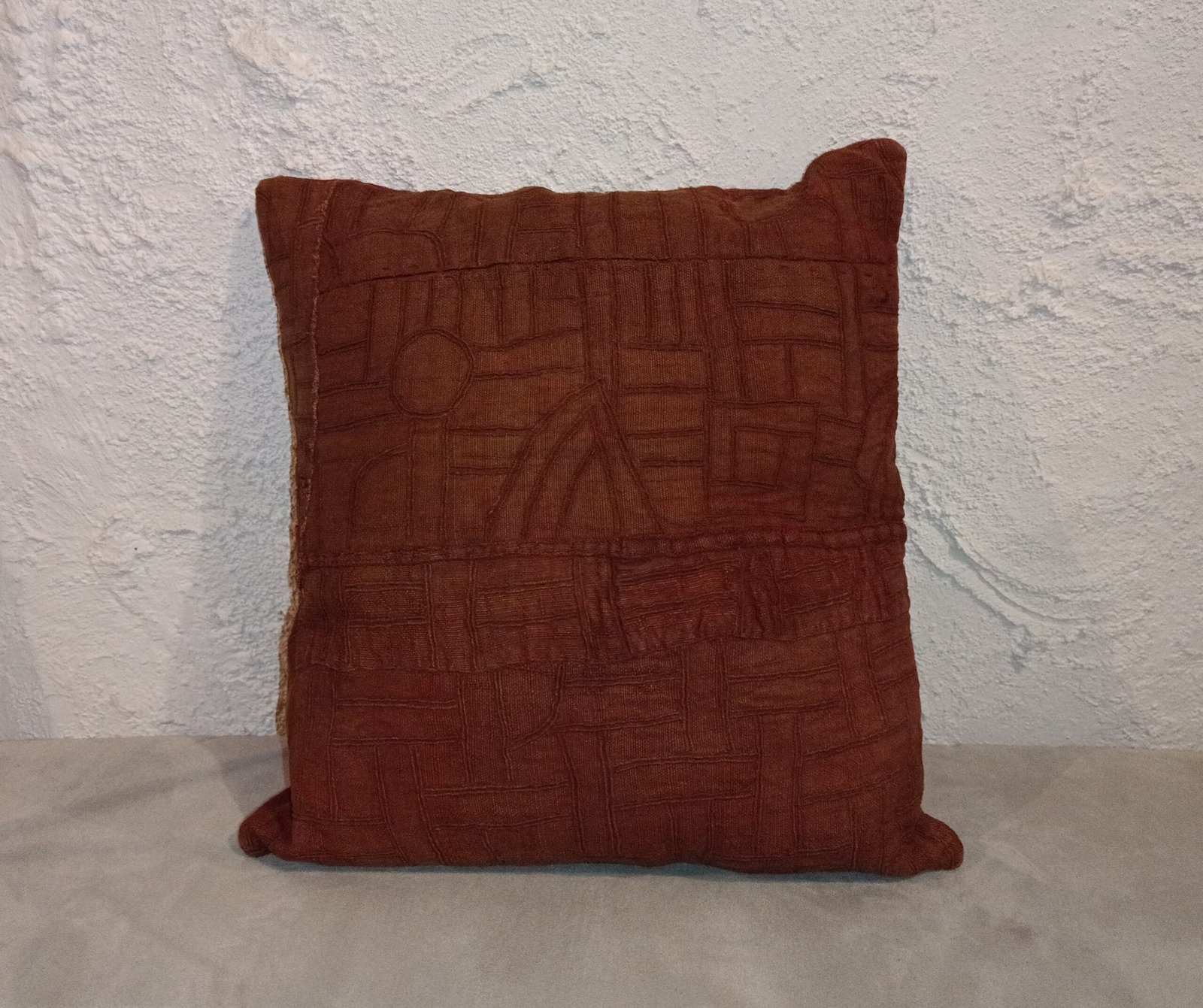 Cette housse de coussin est réalisée en tissu Kuba traditionnel en raphia naturel, teint dans un ton terre cuite profond. Contrairement aux versions multicolores, celle-ci présente un motif entièrement monochrome, brodé ton sur ton, ce qui lui confère une esthétique plus douce, subtile et contemporaine tout en préservant l’héritage graphique des peuples Kuba.