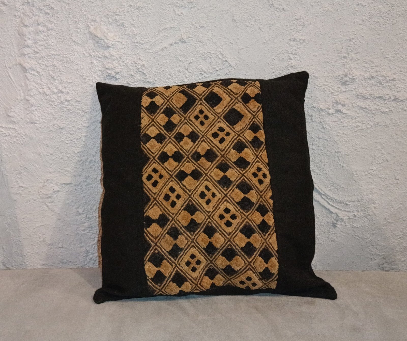 Cette housse de coussin est réalisée à partir d’un tapis Kuba traditionnel, offrant un panneau central en velours géométrique composé de losanges beige et noir, encadré par un tissu brun foncé. Pièce artisanale unique, elle allie élégance, texture et authenticité, idéale pour une décoration ethnique chic, contemporaine ou naturelle.