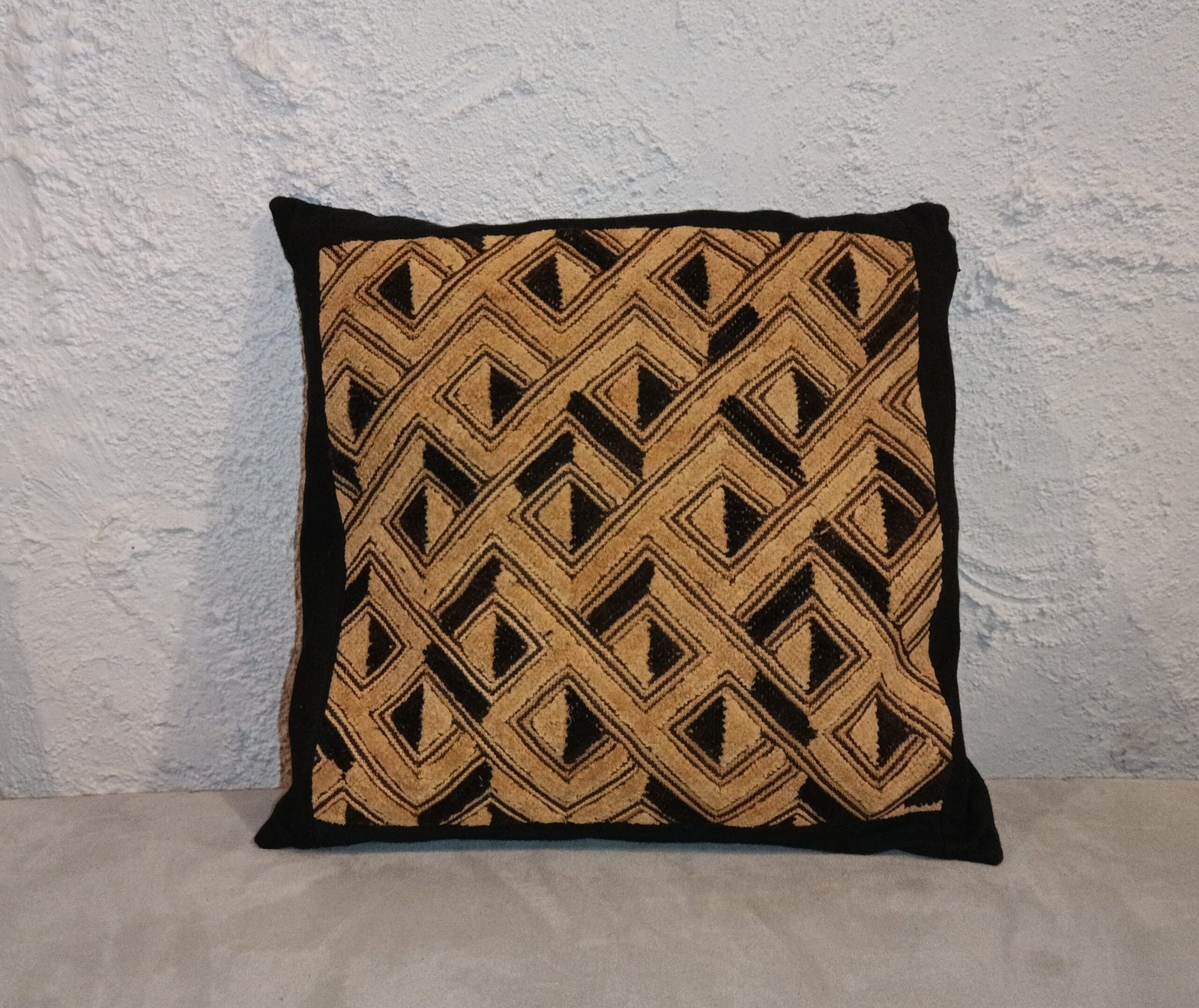 Cette housse de coussin est réalisée à partir d’un tapis Kuba traditionnel, un textile emblématique du Kasaï en République Démocratique du Congo. Le panneau central en velours Kuba présente un motif géométrique d’une grande richesse : une succession de losanges entrelacés, brodés et sculptés dans des tons beige et noir. Le tout est encadré par un tissu noir uni qui met en valeur le graphisme puissant du motif.