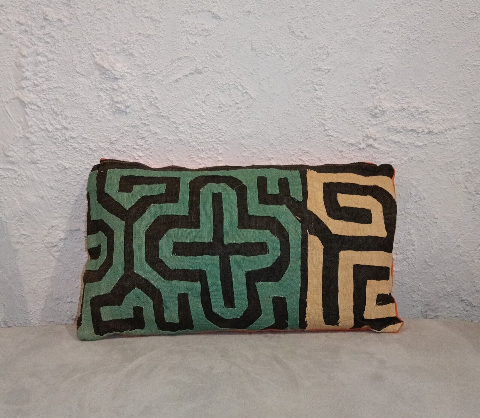 Ce coussin artisanal de 35 x 35 cm est entièrement réalisé à partir de raphia tissé à la main et de tissu Kuba du Kasaï, un textile africain traditionnel issu du savoir-faire unique des artisans du Congo. Le design présente de magnifiques motifs géométriques noirs sur un fond vert profond et beige naturel, caractéristiques de l’esthétique Kuba, connue pour sa richesse graphique et sa symbolique culturelle.