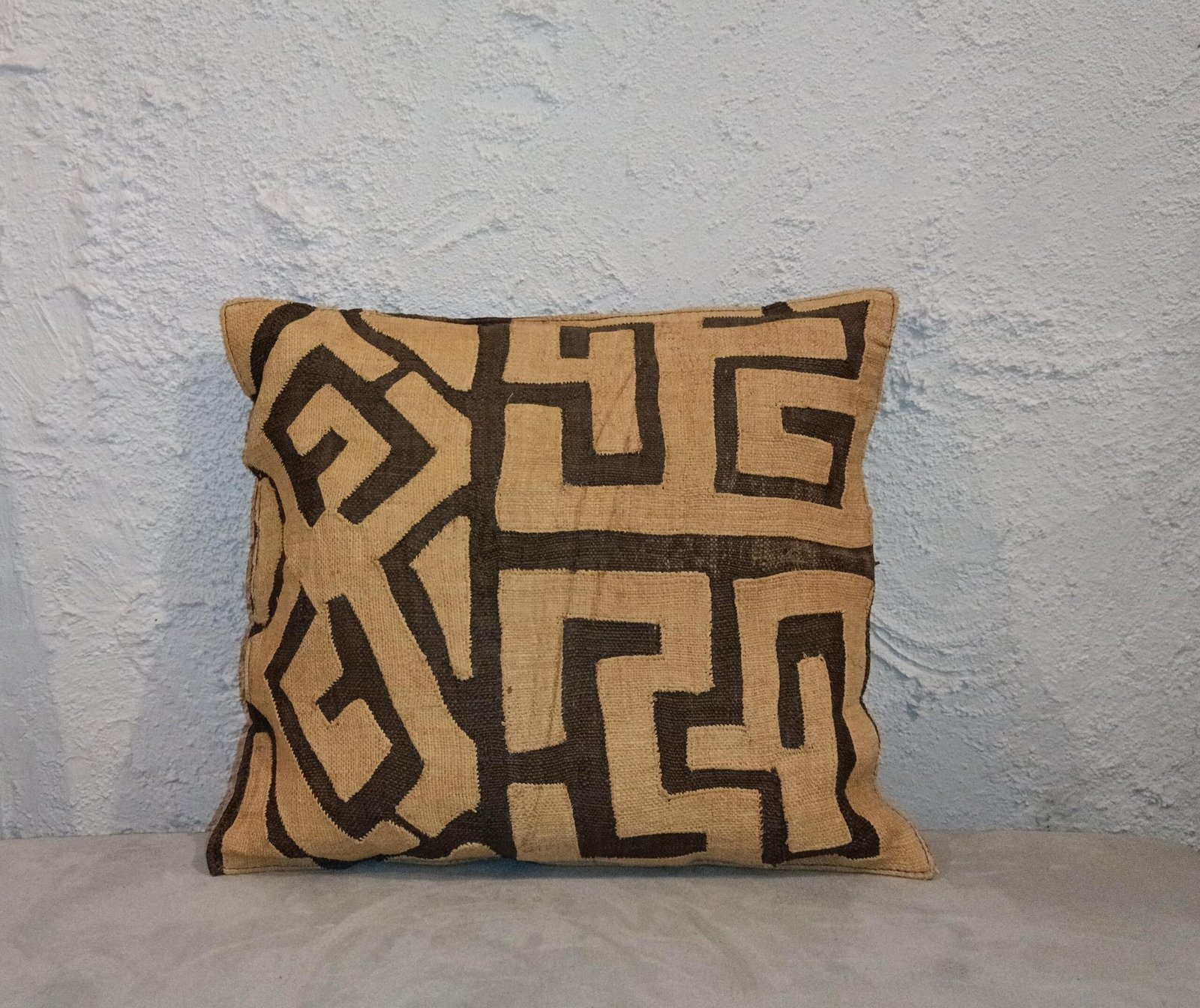 Cette housse de coussin en raphia tissé se distingue par un motif géométrique structuré, composé de formes angulaires continues dans des tons beige sable et brun profond. Son graphisme dense et rythmé en fait une pièce décorative forte, à l’esthétique à la fois primitive et contemporaine.