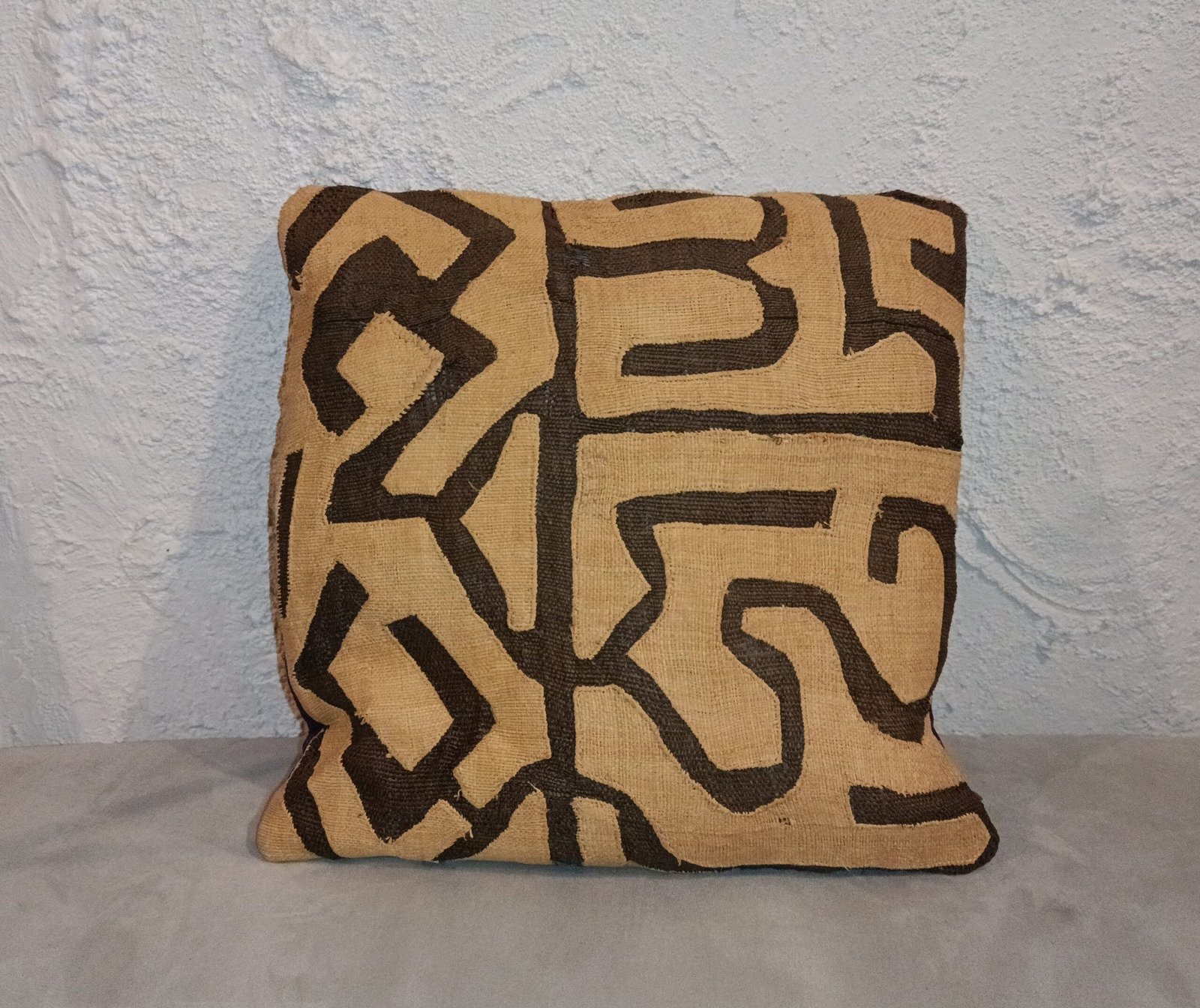 Cette housse de coussin est réalisée en tissu Kuba traditionnel en raphia naturel, un textile artisanal originaire du Kasaï en République Démocratique du Congo. Elle se distingue par son motif graphique brun foncé, constitué de larges lignes appliquées formant un réseau de formes anguleuses et abstraites sur un fond beige naturel.