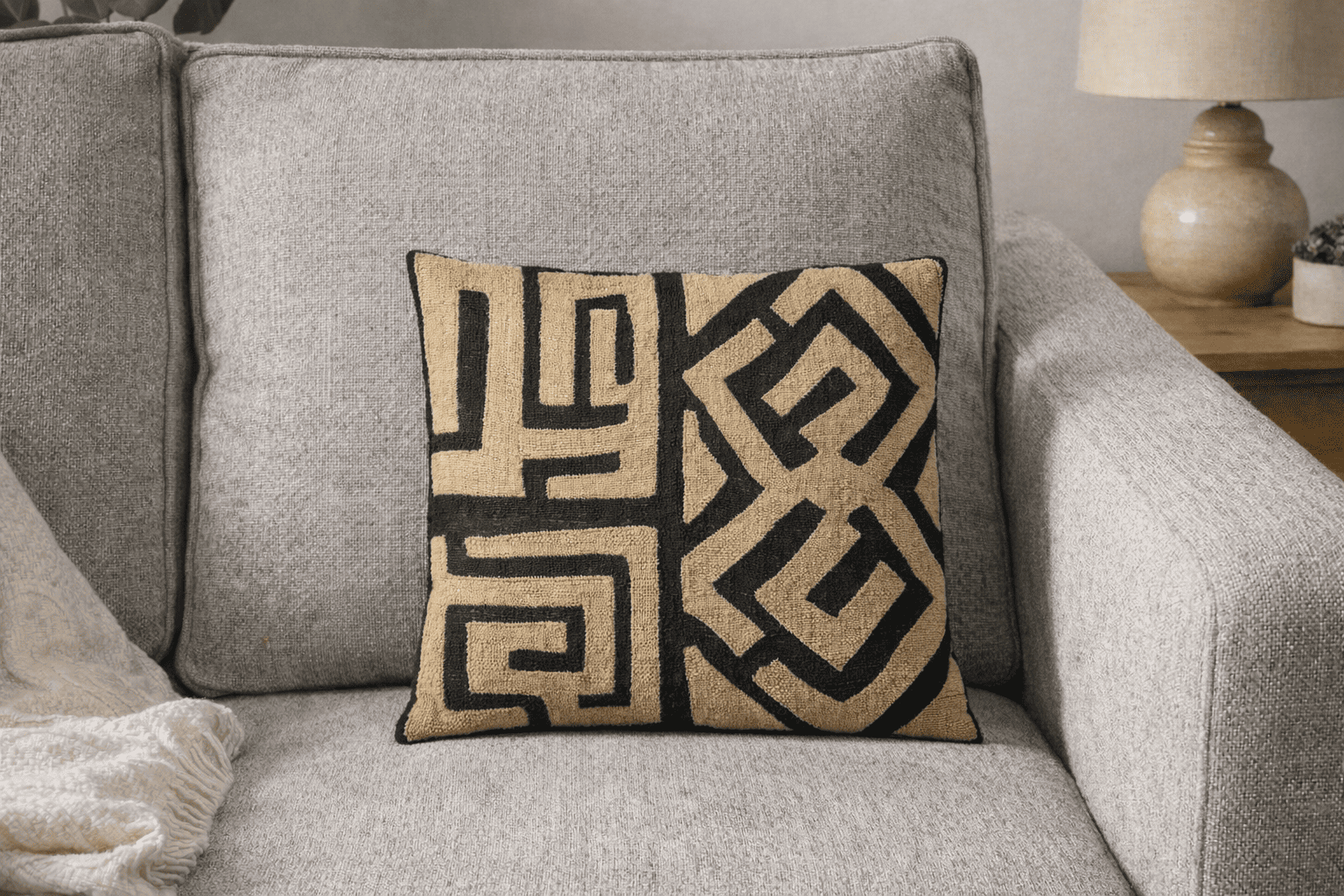 Cette housse de coussin en raphia tissé se distingue par ses motifs géométriques audacieux aux lignes graphiques marquées. Inspirée de l’art textile Kuba du Kasaï, elle apporte une touche artisanale forte et contemporaine à la décoration intérieure.