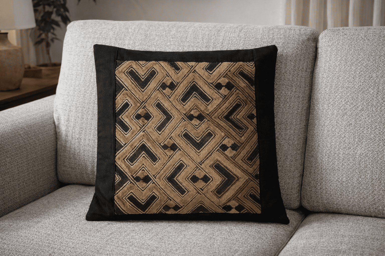 Cette housse de coussin met en avant un panneau central en velours Kuba du Kasaï, composé de motifs géométriques angulaires au graphisme rythmé. Son encadrement en tissu sombre crée un contraste élégant et fait de cette pièce un élément décoratif fort et authentique.