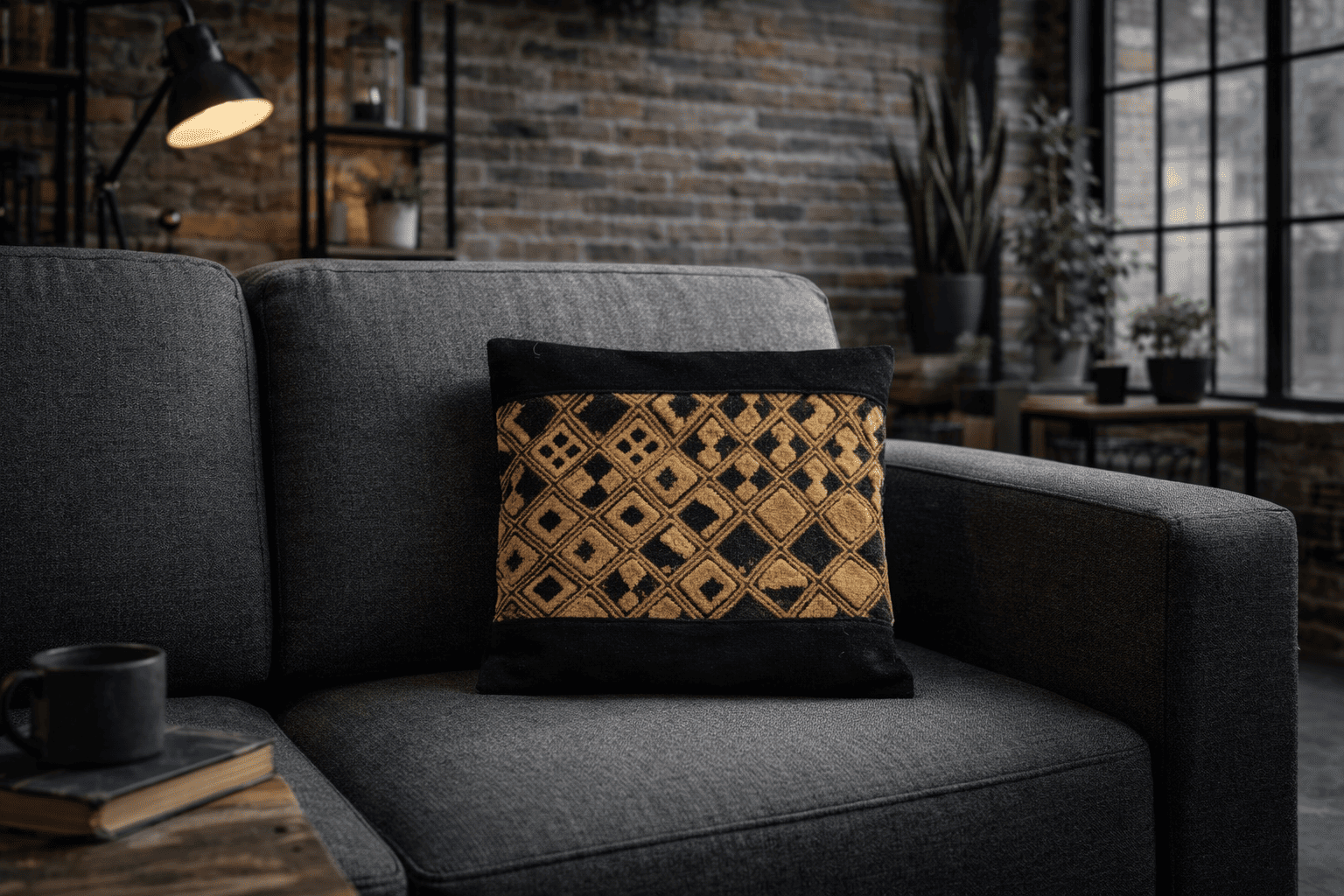 Cette housse de coussin met en valeur un panneau central en velours Kuba du Kasaï, textile emblématique de l’artisanat africain. Le décor se compose d’un motif répétitif de losanges, soigneusement organisé, créant un rythme visuel équilibré et harmonieux. Le contraste entre les tons clairs du velours sculpté et le fond sombre accentue la lisibilité du dessin.