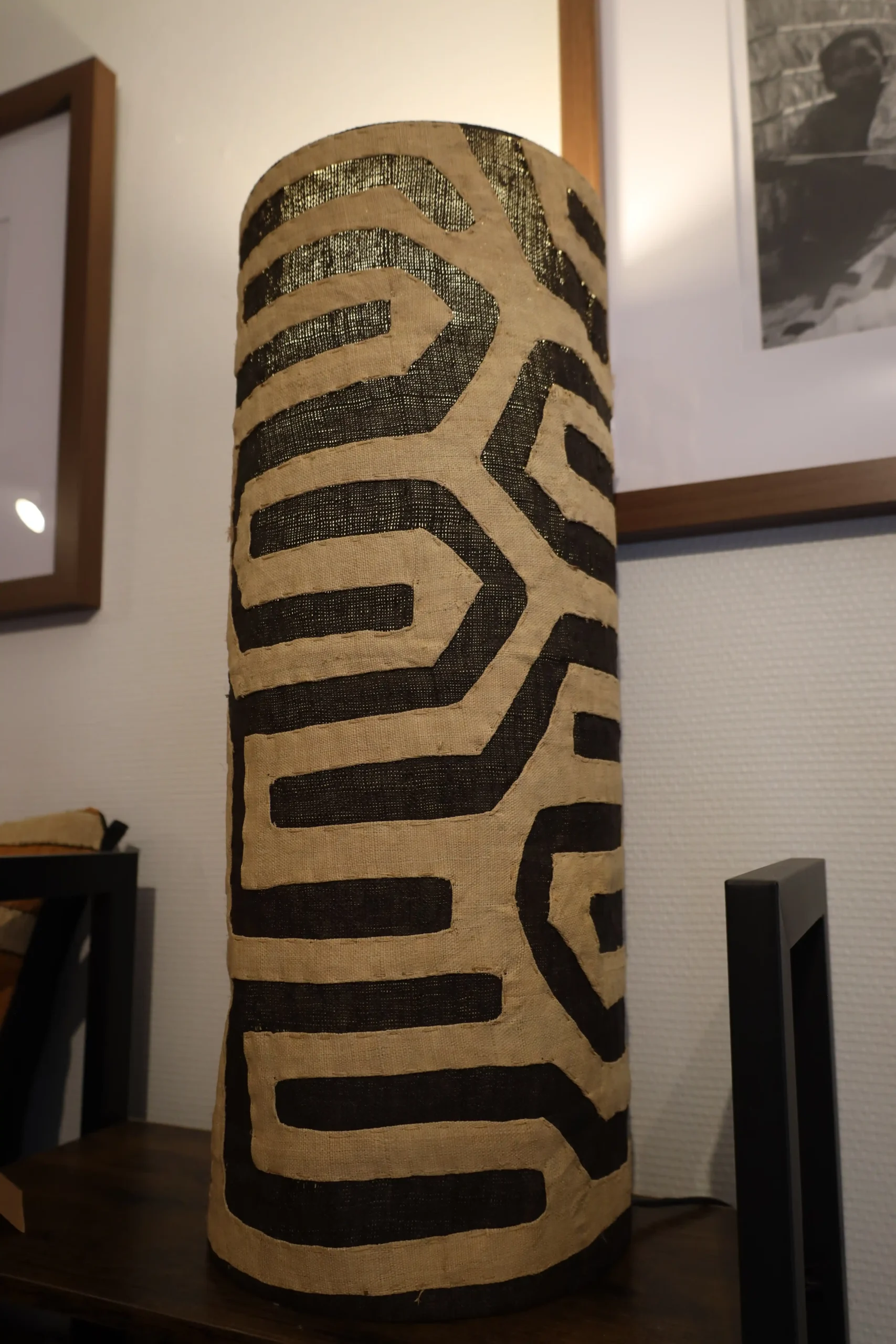 Son abat-jour cylindrique est orné de motifs géométriques noirs sur un fond marron terreux et beige clair, créant un contraste élégant et naturel. Ces formes africaines, inspirées du savoir-faire ancestral Kuba, apportent une touche d’authenticité et de caractère à cette pièce décorative.