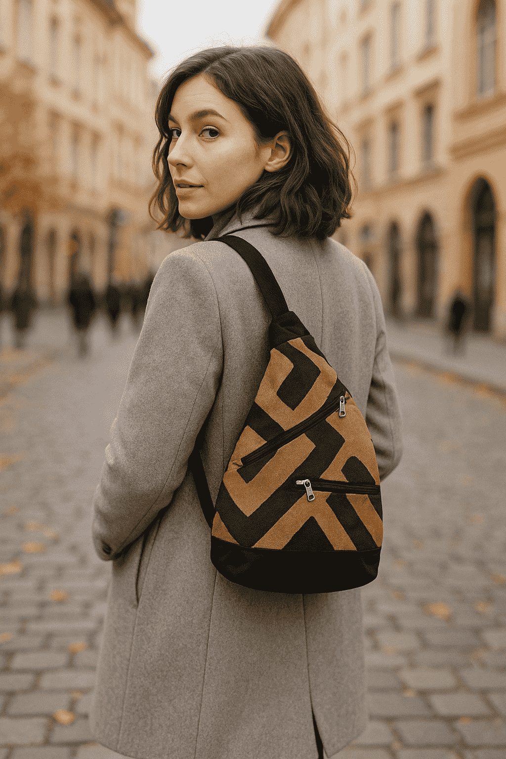 Ce sac sling triangulaire en tissu Kuba allie avec finesse tradition et modernité. Inspiré des savoir-faire ancestraux du peuple Kuba, son tissu présente des motifs géométriques puissants et une palette chaleureuse qui lui confèrent une identité visuelle forte.