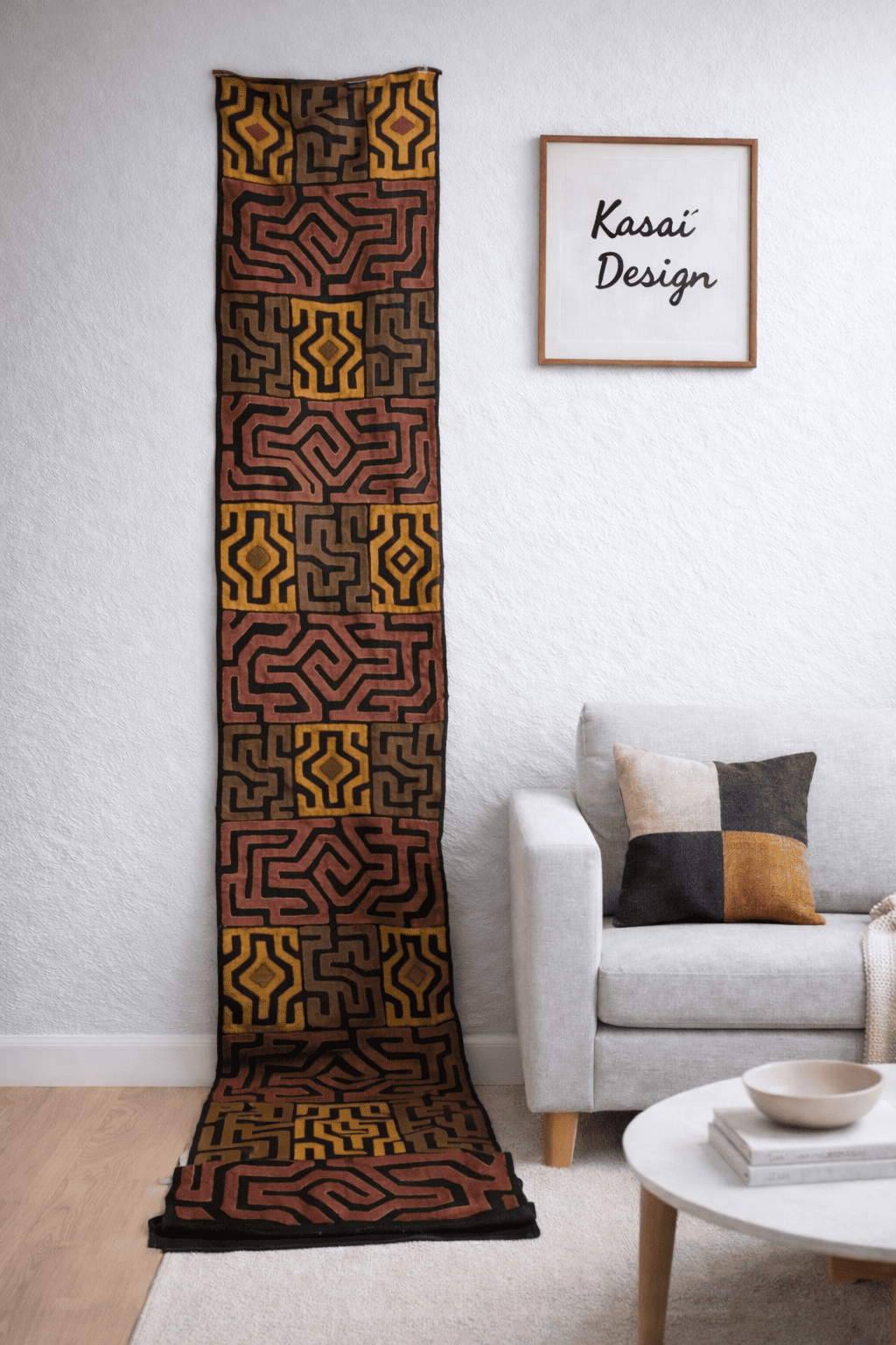 Sublimez votre intérieur avec ce long tapis Kuba en raphia, une pièce artisanale d’exception entièrement réalisée à la main au cœur du Kasaï (RDC). Ses motifs géométriques emblématiques, ses teintes profondes et son élégante finesse en font une œuvre décorative unique, parfaite pour un intérieur ethnique chic, artistique ou contemporain.