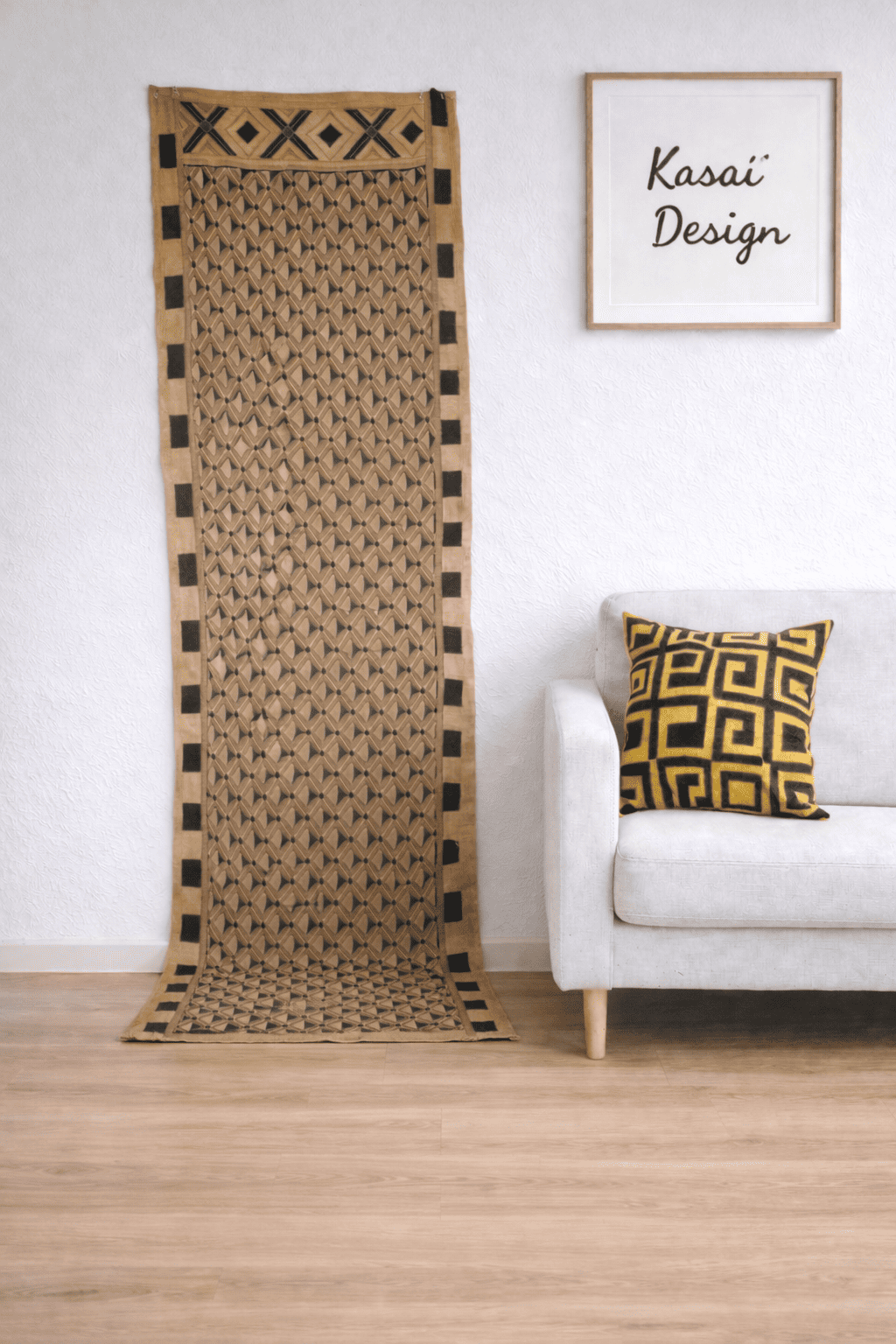 Ce textile, mesurant environ 3 m de long pour 60 cm de large, présente une alternance régulière de losanges et formes géométriques, typiques du savoir-faire Kuba. Les couleurs naturelles, allant du beige au brun foncé, sont obtenues grâce à des teintures traditionnelles à base de terre, racines et végétaux.