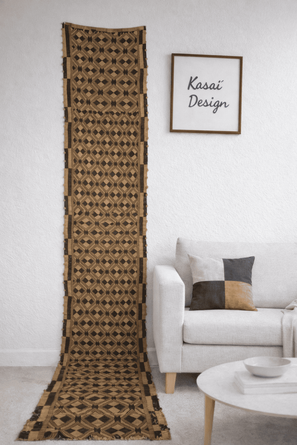Suspendu sur un mur blanc, ce tissu Kuba devient un élément central qui attire immédiatement le regard. Dans un salon moderne, il s’accorde parfaitement avec du bois clair, du lin ou des céramiques mates, apportant une touche d’élégance primitive. Dans une ambiance bohème, ses tons chauds complètent à merveille des textiles doux, des fibres naturelles et des objets artisanaux. Placé derrière une console ou dans un coin galerie, il transforme l’espace en une scène décorative raffinée, rappelant l’esprit des intérieurs ethniques haut de gamme.