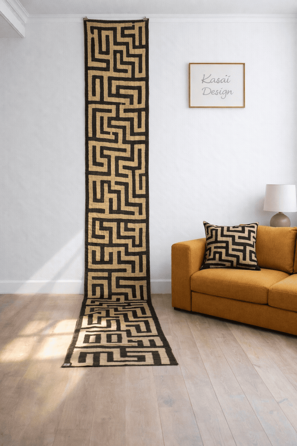 Ce tissu Kuba est une création artisanale unique, réalisée selon un savoir-faire transmis de génération en génération. Le raphia est méticuleusement tissé, puis brodé manuellement, formant une succession de motifs géométriques typiques de l’art Kuba. Ces formes labyrinthiques, disposées en rythme vertical, symbolisent la mémoire, le lien social et l’identité culturelle de ce peuple d’Afrique centrale.