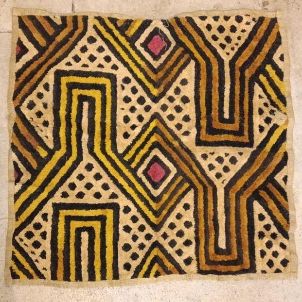 Ce velours Kuba du Kasaï est une création authentique du peuple Kuba, reconnu pour son art textile d’une richesse exceptionnelle. Tissé et brodé à la main à partir de fibres de raphia, il se distingue par ses lignes audacieuses et ses contrastes chromatiques évoquant un labyrinthe géométrique.